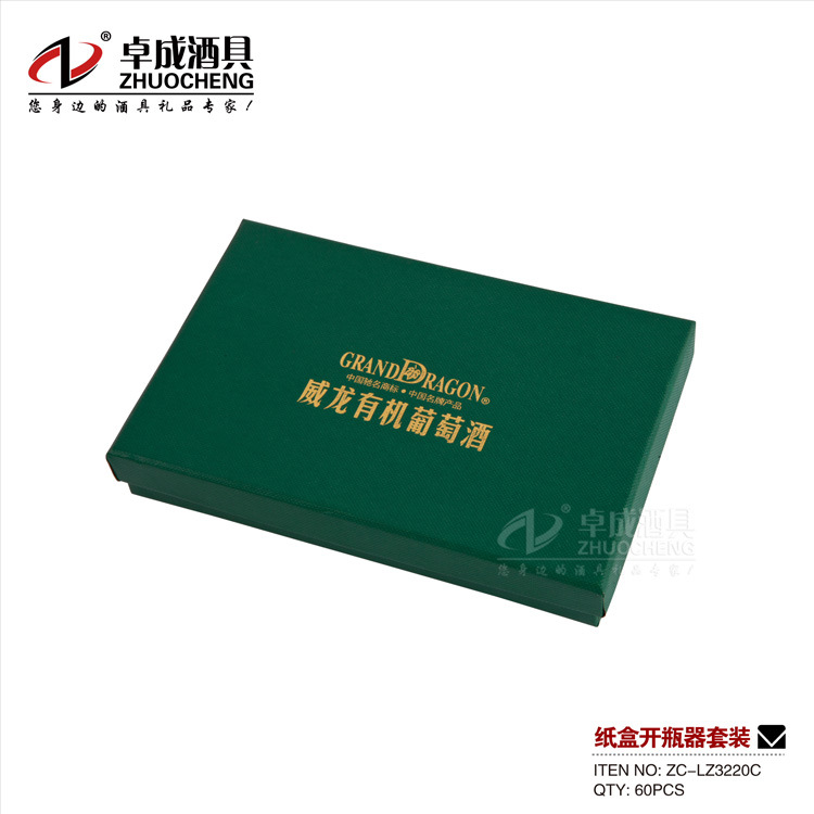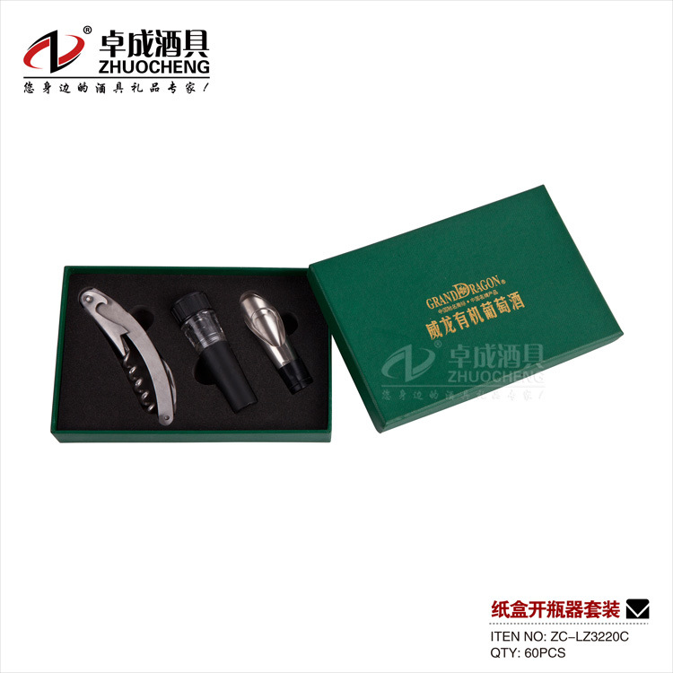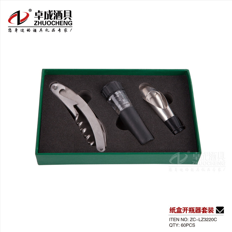 【品名】纸盒开瓶器套装 【编号】ZC-LZ3220C 【材质】不锈钢+锌合金表面光滑,简约大方彰显个性 【配置】 内配置3件套 +黑色植物绒eva | 3件套酒具为:砂光刀 +金属倒酒器+亚克力真空塞 |