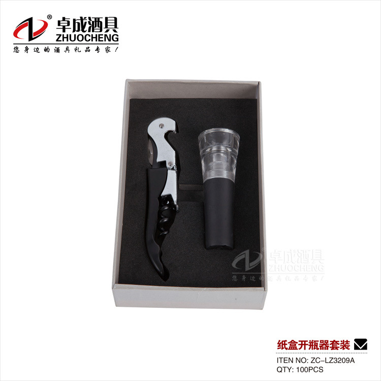 【品名】纸盒开瓶器套装 【编号】ZC-LZ3209A 【材质】不锈钢+锌合金表面光滑,简约大方彰显个性 【配置】 内配置2件套 +黑色植物绒eva | 2件套酒具为:海马刀 +亚克力真空酒塞 |
