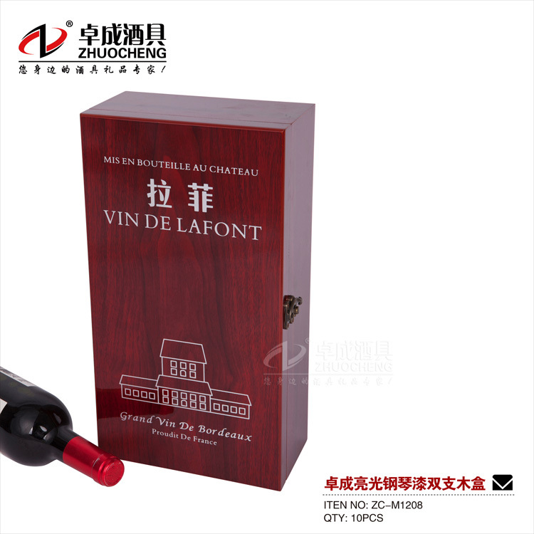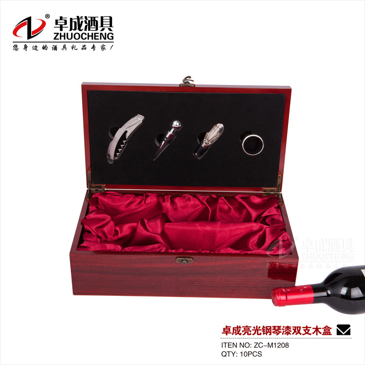 【品名】 卓成亮光钢琴漆双支木盒 【编号】 ZC-M1208 【材质】密度板材料(中纤板),表面贴木纹纸,木纹纸为3分亮光、7分哑光色 【配置】 酒盒内配置红绸及泡沫,内配置常规4件套 +黑色植绒eva | 4件套酒具为:砂光刀+金属倒酒器+红酒酒环+金属酒塞 |