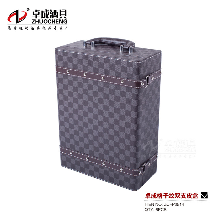 批发红酒礼盒 红酒皮盒 红酒皮盒包装 格子纹双支红酒皮盒包装