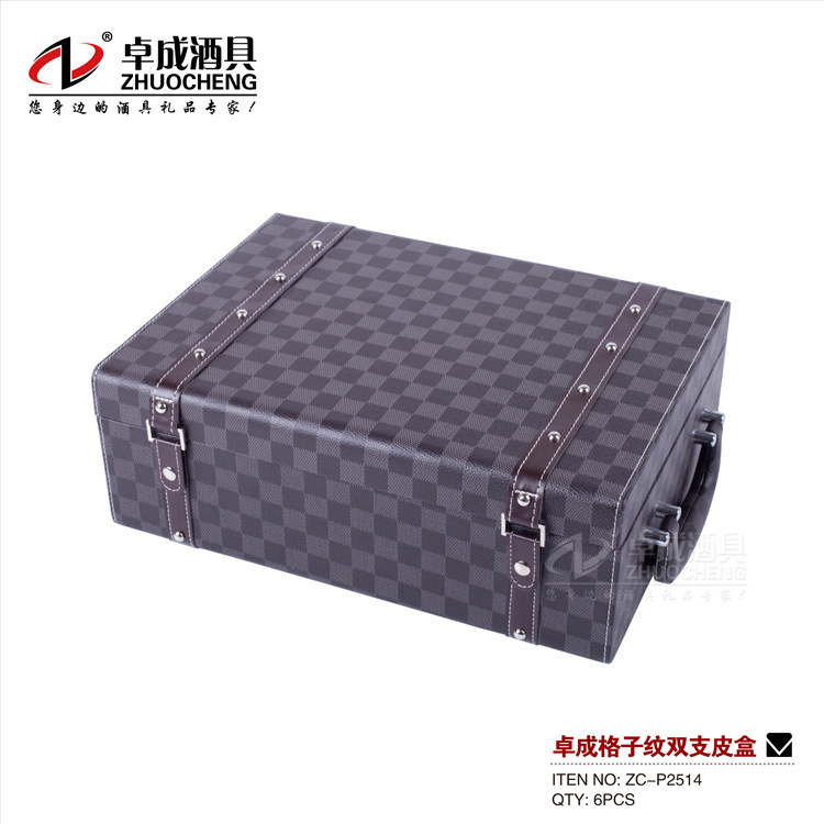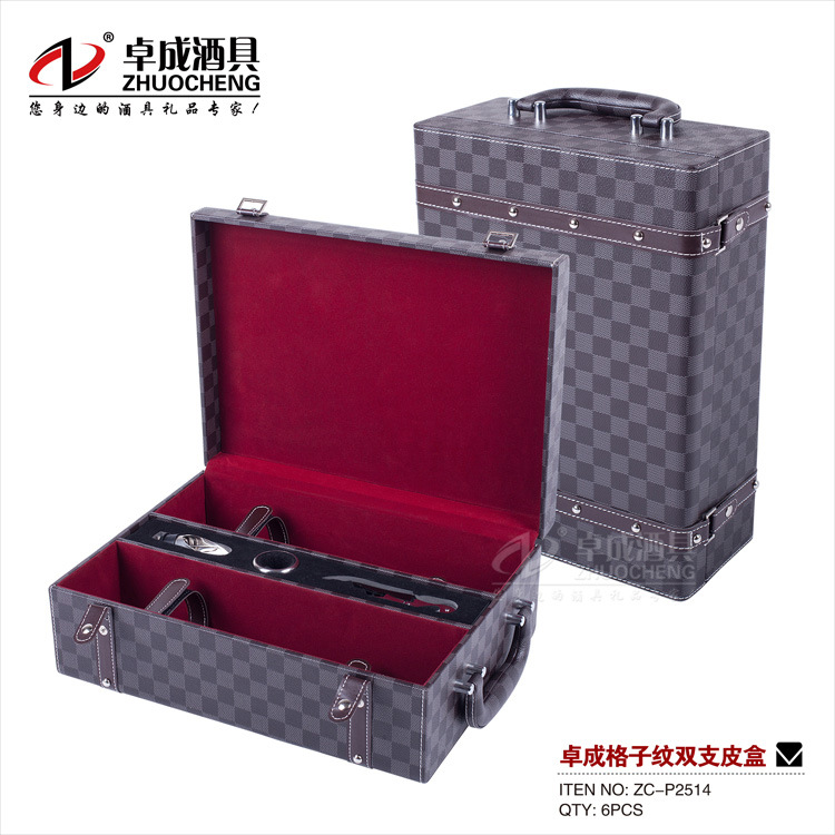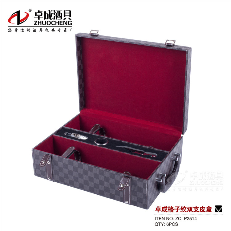 【品名】 格子纹双支红酒皮盒包装 【编号】 ZC-P2514 【材质】 密度板材料(中纤板)及PU材质,皮质颜色为棕色格子纹,配金属方形锁扣 【配置】 酒盒内配置单排皮扣内配置3件套 +植绒eva, | 3件套酒具为:海马刀+倒酒器+红酒酒环 |