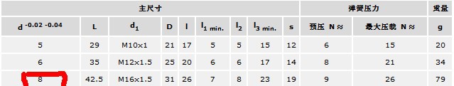 标准件主尺寸弹簧压力重量说明d-0.02 -0.04Ld1Dll1 min.l2l3 min.s预压 N ≈最大压载 N ≈