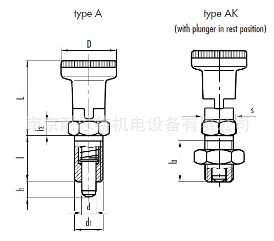 - AK型:带捏手及锁紧螺母,符合ISO8675。