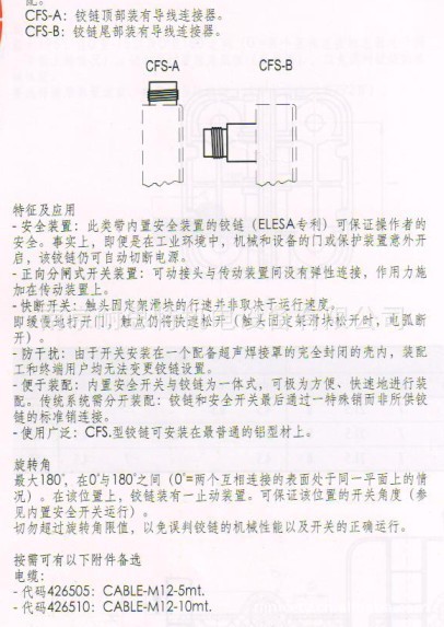 带内置安全开关的铰链,型号CFS.60-45-CO-SH-6-A,CFS.60-45-CO-SH-6-B.此类安全开关可保证操作者的安全. 即便是在工业环境中机械和设备的门或保护装置意外开启,该铰链仍可自动切断电源.
