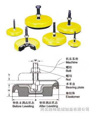 产品特点:减振像胶有效衰减机器知身的振动,减少振动力外传,阻止振动力传入,保证加工尺寸精度及质量。控制建筑物结构谐振传播振动力和噪音。使粗、精加工各类机订组成生产单元,适应物流技术的发展。安装 机床不需要设置地脚螺栓与地面固定,良好的减振和当的垂直度,使机床楼上安装成为可能。可以调节机床水平,调节范围大、方便、快捷。采用丁腈合成橡胶,耐油脂和冷却剂。适用范围:金属加工机床,缎压机床、纺织、印刷机械、食品加工机、橡胶机械、电线、电缆机械、发电机及重型设备。使用方法:将所需垫铁放入机床地脚孔下,穿入螺栓,旋至和承重盘接触实,然后进行机床水平调节(螺栓顺时针旋转,机床升起):调好机床水平后,旋紧螺母,固定水平状态。因为橡胶的里蠕变现象,在垫 铁第一次使用时,两星期以后再调节一次机床水平.产品编号PartNo. 尺寸参数Dimensions(mm) 螺纹Screw(mm) 可调高度Adjustheigh(mm) 单件承载力Load per mountA-B A B H M h1-h2 F(N)S77 105-55 105 55 55 12 8 8000S77 150-75 150 75 61 12 10 16000S77 200-95 200 95 69 16 14 28000S77 250-115 250 115 86 20 16 40000