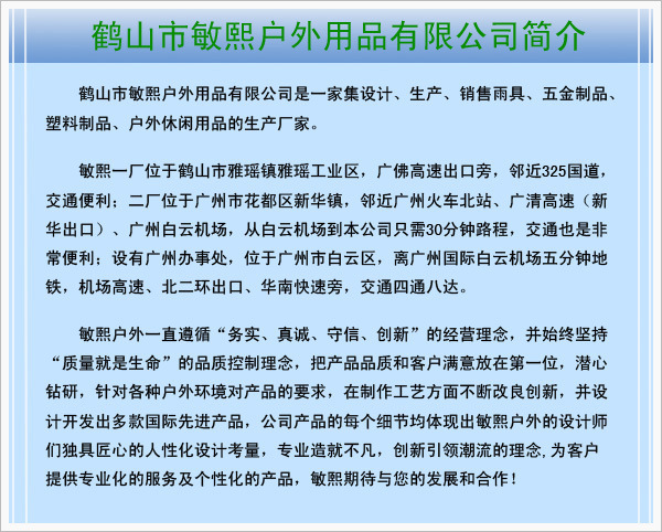 鹤山市敏熙户外用品有限公司是一家集设计、生产、销售雨具、五金制品、塑料制品、户外休闲用品的生产厂家。 敏熙一厂位于鹤山市雅瑶镇雅瑶工业区,广佛高速出口旁,交通便利;二厂位于广州市花都区新华镇,邻近广州火车北站、广清高速(新华出口)、广州白云机场,从白云机场到本公司只需30分钟路程,交通也是非常便利;设有广州办事处,位于广州市白云区,离广州国际白云机场五分钟地铁,机场高速、北二环出口、华南快速旁,交通四通八达。 敏熙户外一直遵循“务实、真诚、守信、创新”的经营理念,并始终坚“质量就是生命”的品质控制理念,把产品品质和客户满意放在第一位,潜心钻研,针对各种户外环境对产品的要求,在制作工艺方面不断改良创新,并设计开发出多款国际先进产品,公司产品的每个细节均体现出敏熙户外的设计师们独具匠心的人性化设计考量,专业造就不凡,创新引领潮流的理念,为客户提供专业化的服务及个性化的产品,敏熙期待与您的发展和合作!
