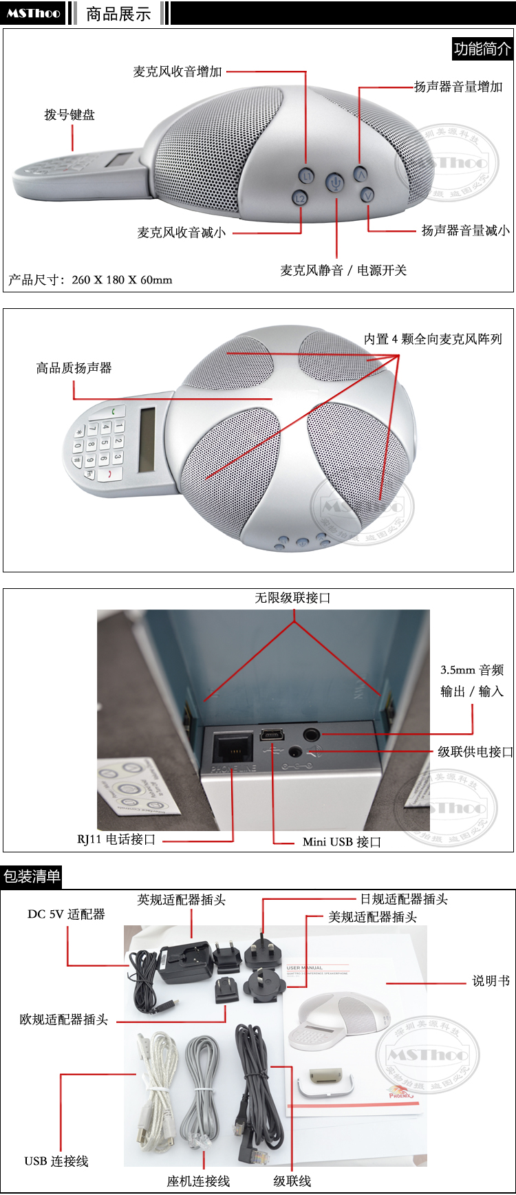 MT302视频会议全向麦克风采用USB免驱动设计,内置扬声器、回音消除,内置4颗大功率全向高灵敏度麦克风,30-80平方米内收音无死角,一人开会时可自由走动,多人会议时,每个人都可以安心坐在自己的位置上,不需特别靠近或是移动全向麦克风。适用于 大中型会议室、个人桌面级的音频采集,内置3.5音频接口可无缝对接(window mobile,iphone, android,塞班四种操作系统智能手机)及各种视频会议软件 、 电话座机(电话线)或QQ、MSN、SKYPE等音频通话,即插即用。