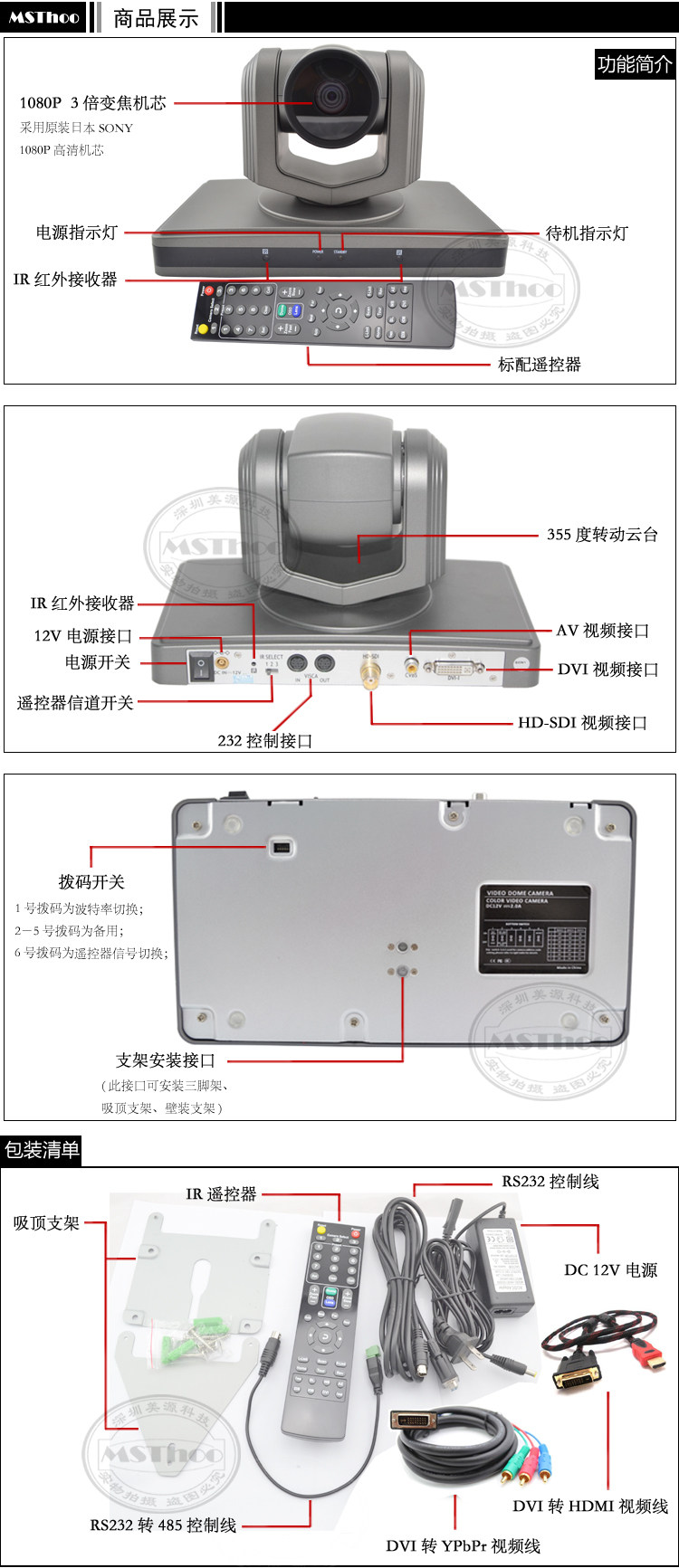 视频会议高速型摄像机MST-HD160-DSY产品是视频会议系统业界专用摄像机,采用日本原装SONY全高清1080P机芯(原始图像,绝对没有压缩)。外形美观、造型别致、结构紧凑;运行平稳、无噪声;定位精确、停止时无偏差抖动,可靠性高;可长期稳定运行,使用方便,无须维护。具有多点目标预置、记忆、区域扫描、辅助开关控制、红外遥控等功能。355°水平无限制扫描范围,兼容多种控制协议,采用标准RS485/RS232控制方式。