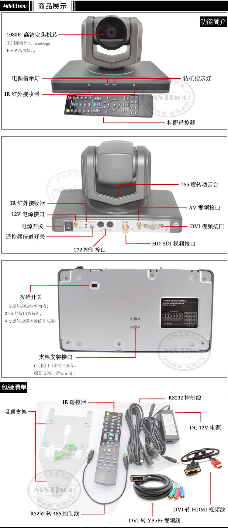 高清视频会议摄像机MST-HD80-DSY产品是视频会议系统业界专用摄像机,采用日本原装全高清1080P机芯(原始图像,绝对没有压缩)。外形美观、造型别致、结构紧凑;运行平稳、无噪声;定位精确、停止时无偏差抖动,可靠性高;可长期稳定运行,使用方便,无须维护。具有多点目标预置、记忆、区域扫描、辅助开关控制、红外遥控等功能。355°水平无限制扫描范围,兼容多种控制协议,采用标准RS485/RS232控制方式。
