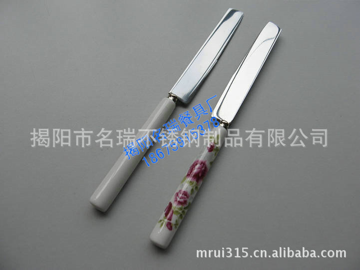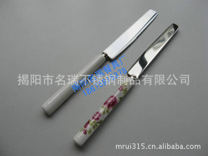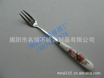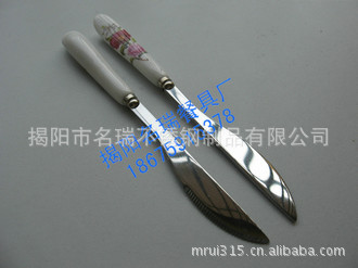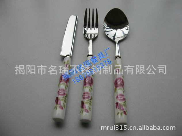 描述:环保卫生,生活必备之品,刀子可以吃月饼切水果,勺子可以喝咖啡,叉子可以吃水果,餐具上节精美陶瓷设计,下节不锈钢设计,高档环保卫生方便