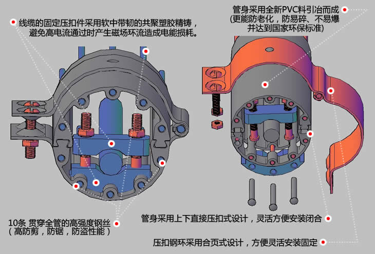 - 管身内装用10条贯穿头尾的高强度防剪钢丝,具有非常优良的防剪、防锯、防盗性能。