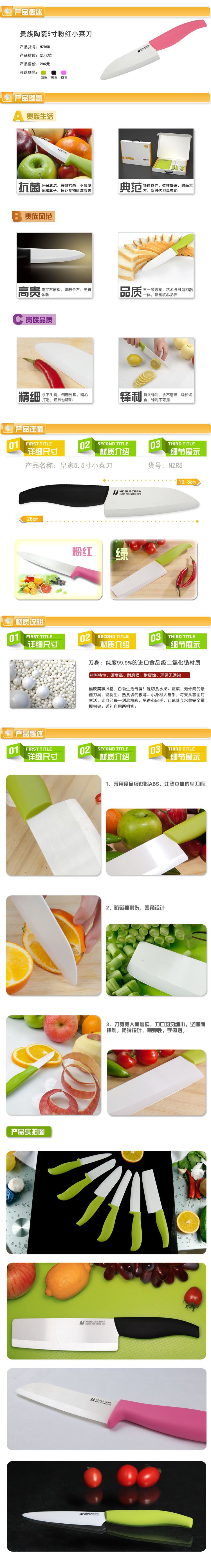 贵族品牌一直最求洁净、品质以及。贵族品牌一直致力成为陶瓷刀行业品质典范,引领陶瓷刀行业时尚潮流,以追求卓越创引精致生活的理念,竭力把我们的服务做到极致。贵族特种陶瓷刀是指采用纳米高纯度超微精细氧化锆粉粒经过成型、等静压、烧结以及精密加工而成的高科技产品。同钢刀相比,陶瓷刀具有如下几大特点。