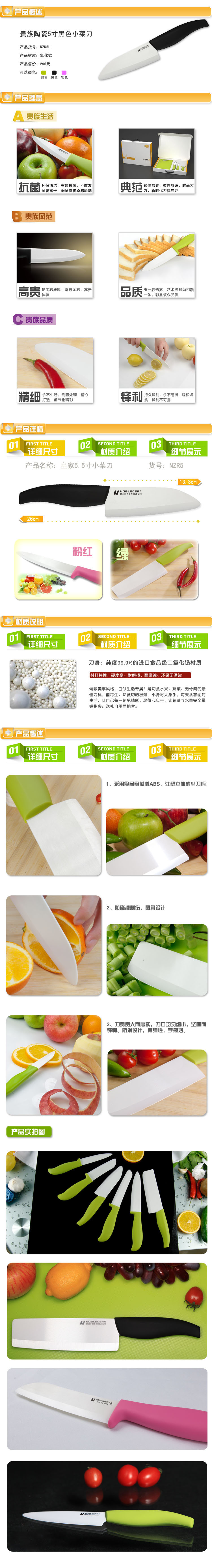 贵族品牌一直最求洁净、品质以及。贵族品牌一直致力成为陶瓷刀行业品质典范,引领陶瓷刀行业时尚潮流,以追求卓越创引精致生活的理念,竭力把我们的服务做到极致。贵族特种陶瓷刀是指采用纳米高纯度超微精细氧化锆粉粒经过成型、等静压、烧结以及精密加工而成的高科技产品。同钢刀相比,陶瓷刀具有如下几大特点。