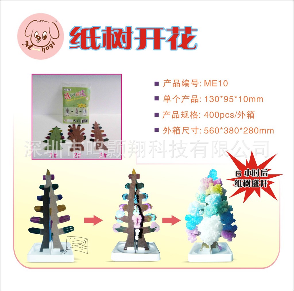 我公司生产和销售各种纸树开花,有动物,植物和各种花的形状,也可以做为鬼节,圣诞节等礼品赠品,---使用方法:将纸花安插在产品的塑胶托盘之间,然后将产品自带的药水放到托盘里边,随着时间的推移纸卡上会慢慢的长出雪花状的结晶体,6个小时后会长成雪花构成的树。颜色鲜艳十分漂亮。