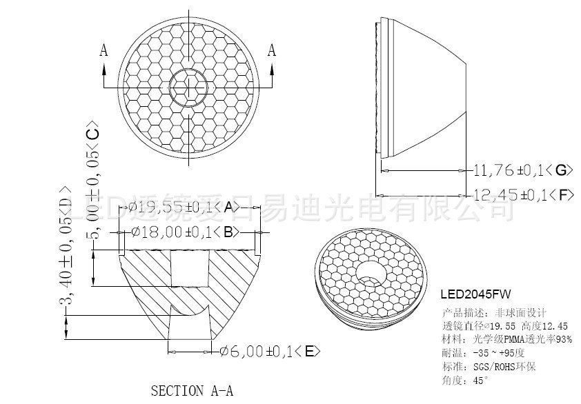 3.本产品采用高精度,非球面光学设计,采用德国原装进口光学级PMMA原料,保证足够的注塑成型时(降低产品缩水率)我们有优良的品质部,对产品要求及其严格,全部符合国家及出口标准,对产品采用防静电防震包装。所有产品均通过SGS认证及符合ROHS环保要求。