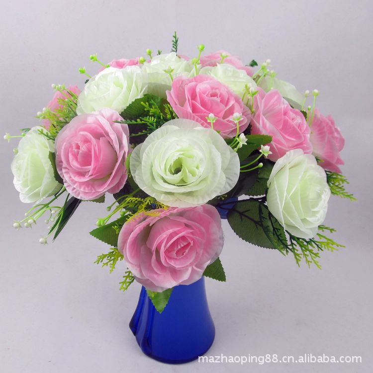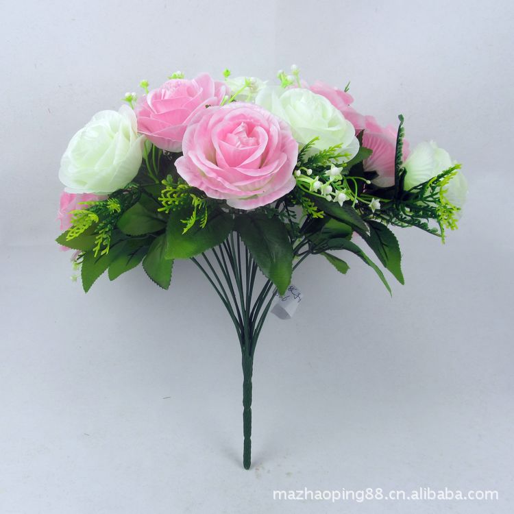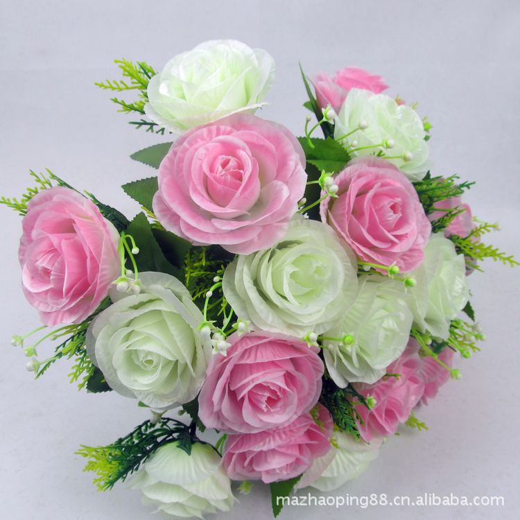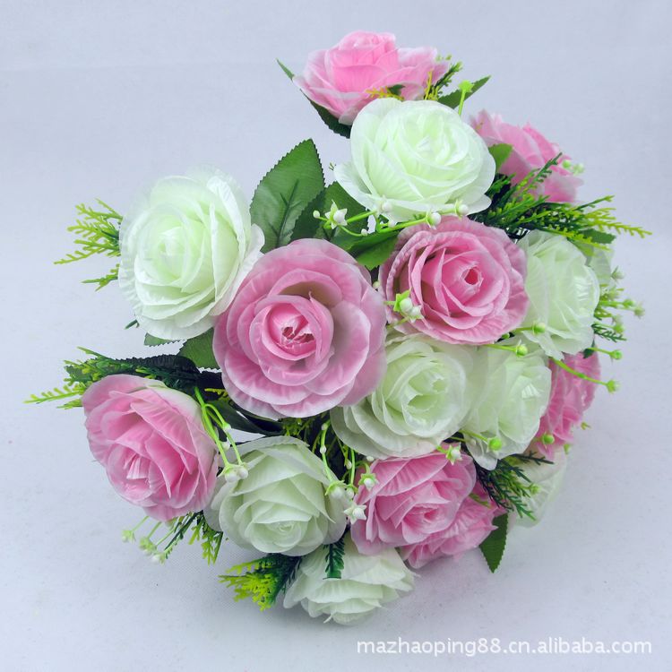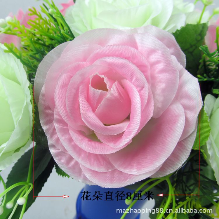 规格;高 36厘米,18 头枝干。花朵直径8厘米,是亮光布绢布的哦,不是那种便宜的布做的,花片层数多,做工更精细。配件,花叶都比较多。花束的棚幅可以到40厘米,买家可以把自己有的18头手捧花拿来对比一下,花束是混色,目前就一个粉色奶白混色的图片,我们会在日后逐渐上传其他颜色的图片,买家还可以指定自己的颜色混搭,我们将尽力满足,买家要求。