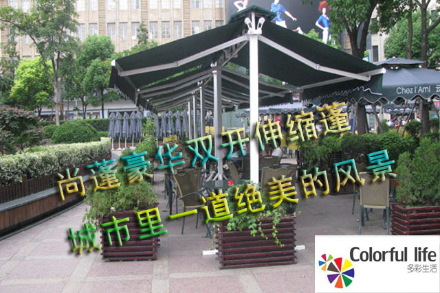 3:篷布颜色有70多款,可以采用丝网印刷印LOGO,比如图上的沃尔沃LOGO、云天吧、空中酒吧、凯旋门、阳春巷茶庄等等客人设计的LOGO,且篷布有防水功能!多彩的篷布和周围环境相搭配,更能体现装饰效果!