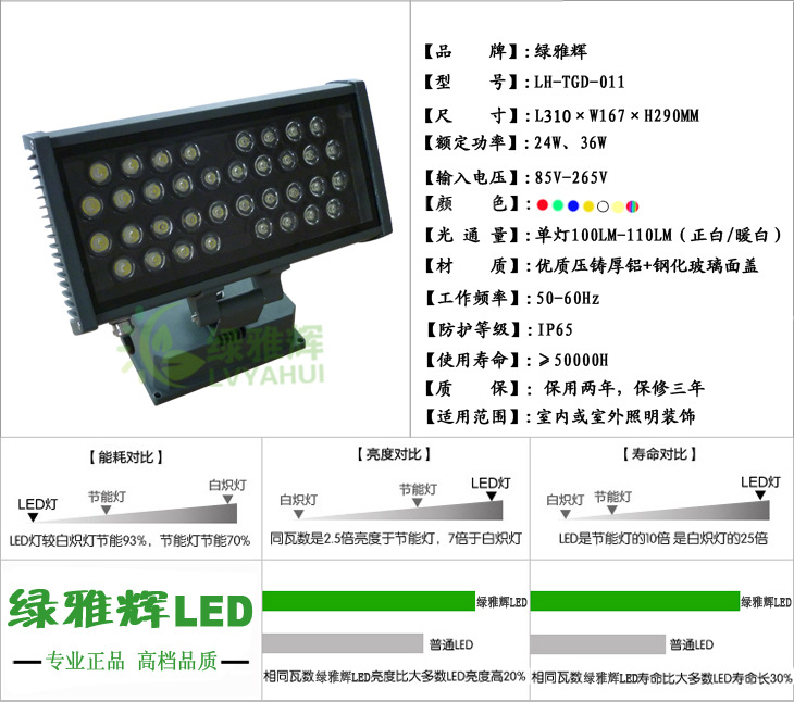 1、LED投光灯采用高亮度进口芯片,亮度高,低能耗,低热量,寿命长达到 50000H,可分为单色,七彩变色两种。 2、LED投光灯外壳采用高级氧化喷涂铝型材和整体模压加工工艺,钢化玻璃面盖,确保了良好的散热效果,有效的减少了LED使用过程中的光衰。 3、LED投光灯采光光学级PMMA高效透镜,光损小、照度好。 4、LED投光灯采用滚边等新工艺,确保外壳整体性好,密封可靠,防水防尘达IP65。 5、LED投光灯使用电压12V、24V、85V-265V可选。 6、LED投光灯投射距离达10-20米以上,特别适合景观建筑物楼体,户外广场,墙面、陈列品刷色 。 7、LED投光灯具有良好的电磁兼容性,不会对周边环境造成电磁干扰。 8、LED投光灯使用低压电源,安全可靠,耗电少,使用寿命长结实耐用,安装操作程序简单。 9、LED投光灯广泛应用于单体建筑、历史建筑群外墙照明、大楼内光外透照明、室内局部照明、绿化景观照明、广告牌照明、医疗文化等专门设施照明、酒吧、舞厅等娱乐场所气氛照明等。 |