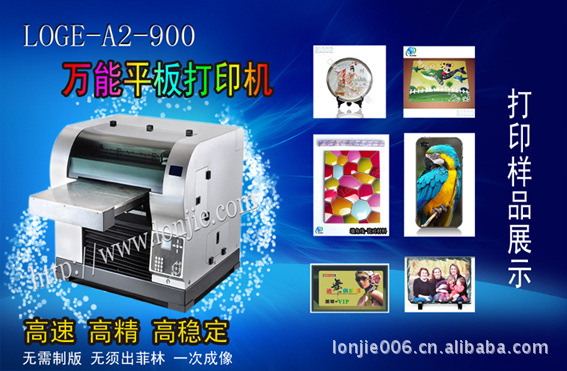 万能平板印刷机,可在标牌、 油画布,木板,玻璃,水晶,PVC,,ABS,亚克力,金属,塑料,皮革,U盘,外壳,硅胶,布料,等表面进行彩色印刷,能一次印刷完成,无需制版,晒版,出菲林,拉网和重复套色,色彩亮丽丰富,效果逼真,图像防水,防晒,耐磨损,抗酸碱,不退色,