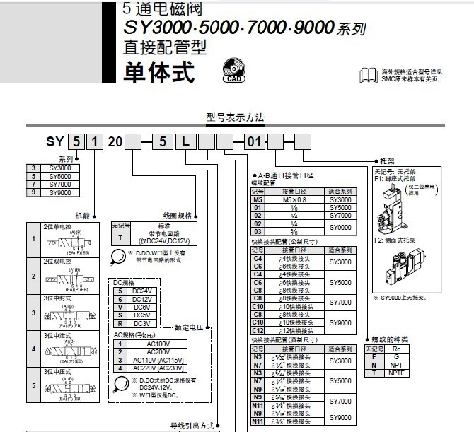 7)SMC SY电磁阀增加集装阀的数量是可能的。插入式连接方式。导线方式多样。
