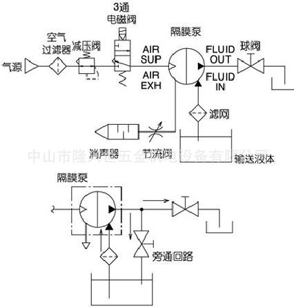 双作用气控型隔膜泵的控制回路如下图。将减压阀的设定压力设定在0.2~0.7MPa,电磁阀一通电,泵便开始工作,但液体输出侧的球阀处于开启状态。泵开始工作前,泵内无液体(干状态),也能吸入液体。在干状态下的最大吸入扬程为1m。让泵停止工作,让电磁阀断电,泵内气压力便从三通电磁阀泄掉。也可关闭液体输出侧的球阀让泵停止工作。输出流量的调节可利用球阀或节流阀进行。隔膜泵的输出流量若小于最低流量要求,泵会犹豫工作不稳定而停止。若要求输出流量小于最低流量,可在输出侧旁通回路来解决,确保泵内达到最低流量。