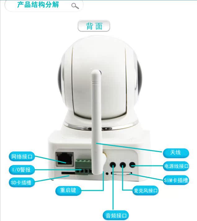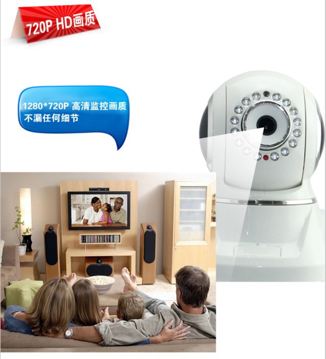 ◆支持IOS和Android系统◆支持64G 存储卡◆水平玄黄355度,上下俯仰270度◆CMOS 1/4英寸 130W像素◆8颗红外线补光灯,自动开启补光◆1280x720P 30fps画质分辨率,H.264压缩◆wi-fi规格:802.11b/g/n◆电源:5V 2A,傻瓜式操作,非常简单