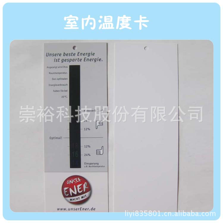 室内温度卡是采用纸、PVC或PP等塑料板双面四色印刷,再处理液晶变色温度计上去(具有了测量温度的功能,它可以放在室内、车内或婴儿房内,随时监控环境温度).表面可以做公司LOGO入广告标语.形状及图案可以按你的设计要求来订做.图案清晰.颜色鲜艳.