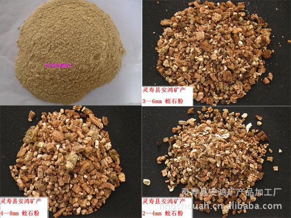 金黄色蛭石粉由蛭石片经过烧制,膨胀后形成的膨胀蛭石,再经过加工成粉末状,然后分目。