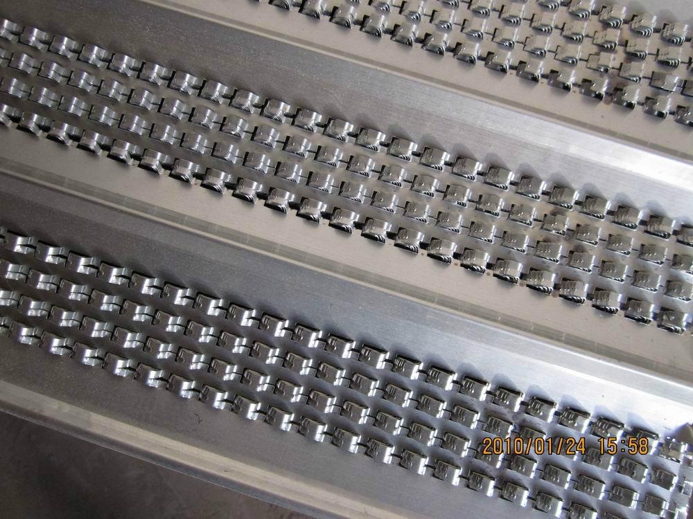 一张完整的免拆模板网包括连续凸起的V型网骨及钢网面二部份。V型网骨劲度,连续平行排列的V型网骨为钢网强度的主要来源。钢网可沿V型平行方向弧形弯曲。钢网面上具有整齐的冲孔,冲孔上有凸起的牙板具有加强钢网与材料间的结合之功能。