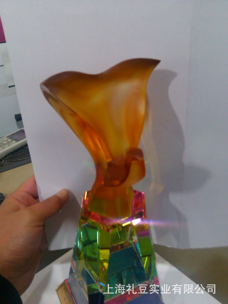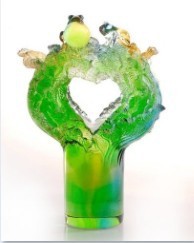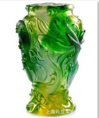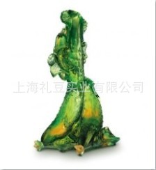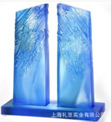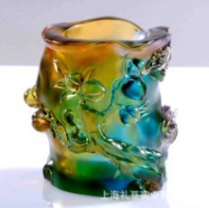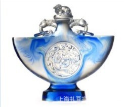 琉璃,亦作“瑠璃”,是指用各种颜色的人造水晶(含24%的二氧化铅)为原料,采用古代青铜脱蜡铸造法高温脱蜡而成的水晶作品。其色彩流云漓彩、美轮美焕;其品质晶莹剔透、光彩夺目。这个过程需经过数十道手工精心操作方能完成,稍有疏忽即可造成失败或瑕疵。