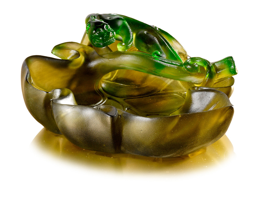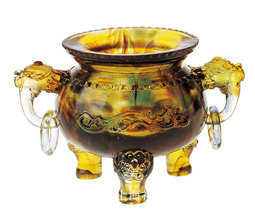 琉璃,亦作“瑠璃”,是指用各种颜色的人造水晶(含24%的二氧化铅)为原料,采用古代青铜脱蜡铸造法高温脱蜡而成的水晶作品。其色彩流云漓彩、美轮美焕;其品质晶莹剔透、光彩夺目。这个过程需经过数十道手工精心操作方能完成,稍有疏忽即可造成失败或瑕疵。