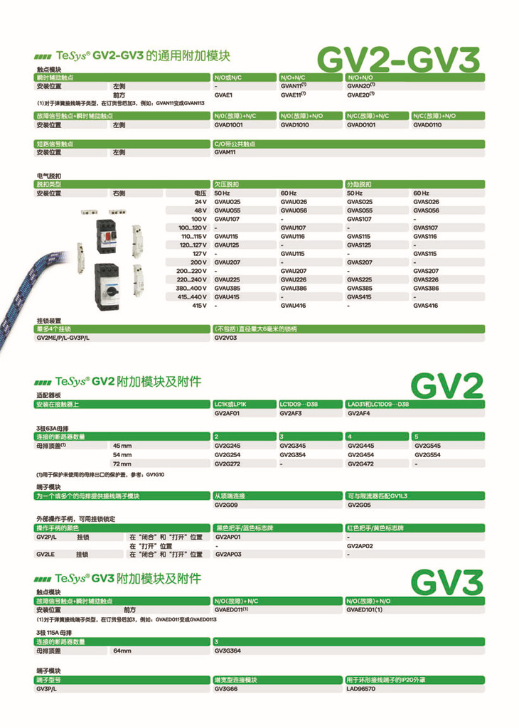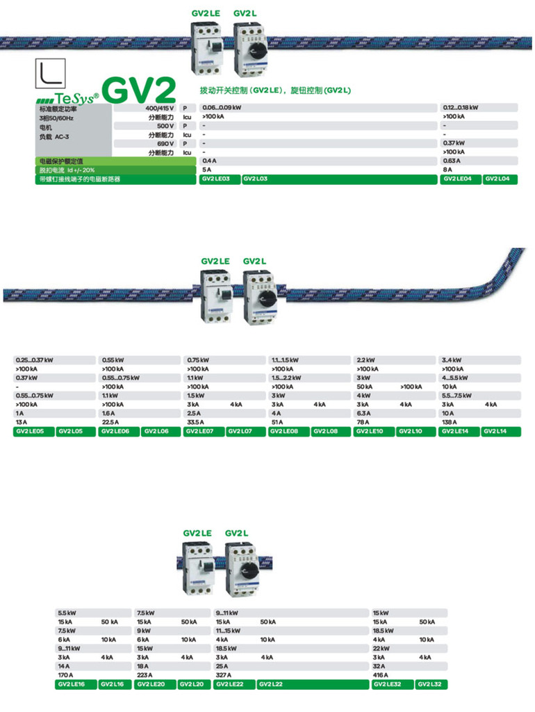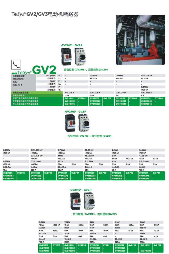 - 紧凑而简洁,TeSys GV2电动机断路器只有45mm宽,并根据控制类型,分断能力,电动机保护元件及配件等不同性能和功能进行分类。