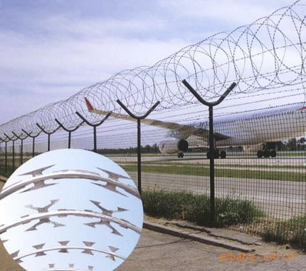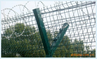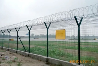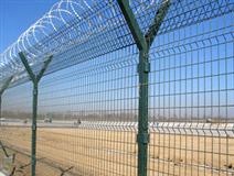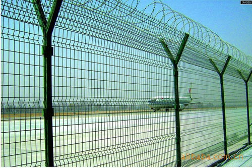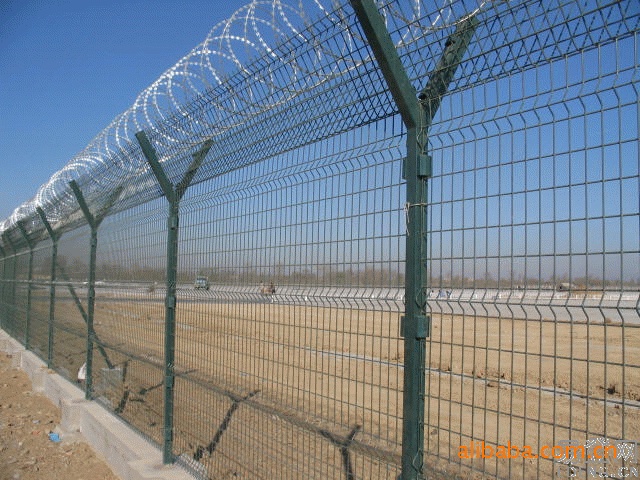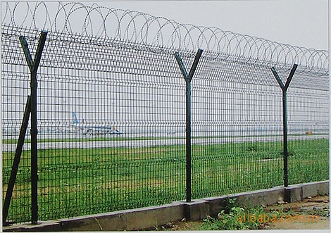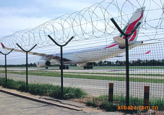 机场护栏网又称作“Y型安全防御护网”,它是由V型支架立拄,加强型焊接片网,安全防盗连接件和热镀锌刀片刺笼组成是强度和安全防御性级别很高的围界产品。被广泛应用在机场,军事基地等高安全场所。这种护栏网的突出特点就是“美观 实用”,安全性高,防攀爬能力好,网体连接方式采用特制SBS紧扣件,有效防止人为的破坏性拆卸,横向四道折弯加强筋,使网面强度显著增加。