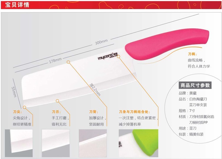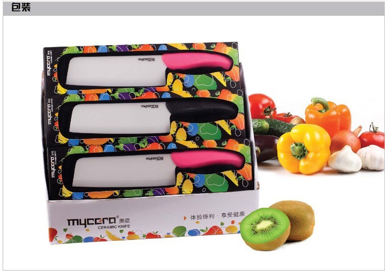 美瓷刀MYCERA 陶瓷刀,欧美日发达国家的许多家居生活都已在使用,陶瓷刀代替金属刀已经成为一种趋势,陶瓷刀在国内有“贵族刀”之称,近年来已成为礼品市场的新宠。美瓷凭借雄厚实力,率先掀起“普及风暴”,令顾客轻松消费,让美瓷刀走进千家万户。而美瓷刀致力于中国的巨大的陶瓷刀市场,陶瓷厨房刀市场在中国机会是巨大的。