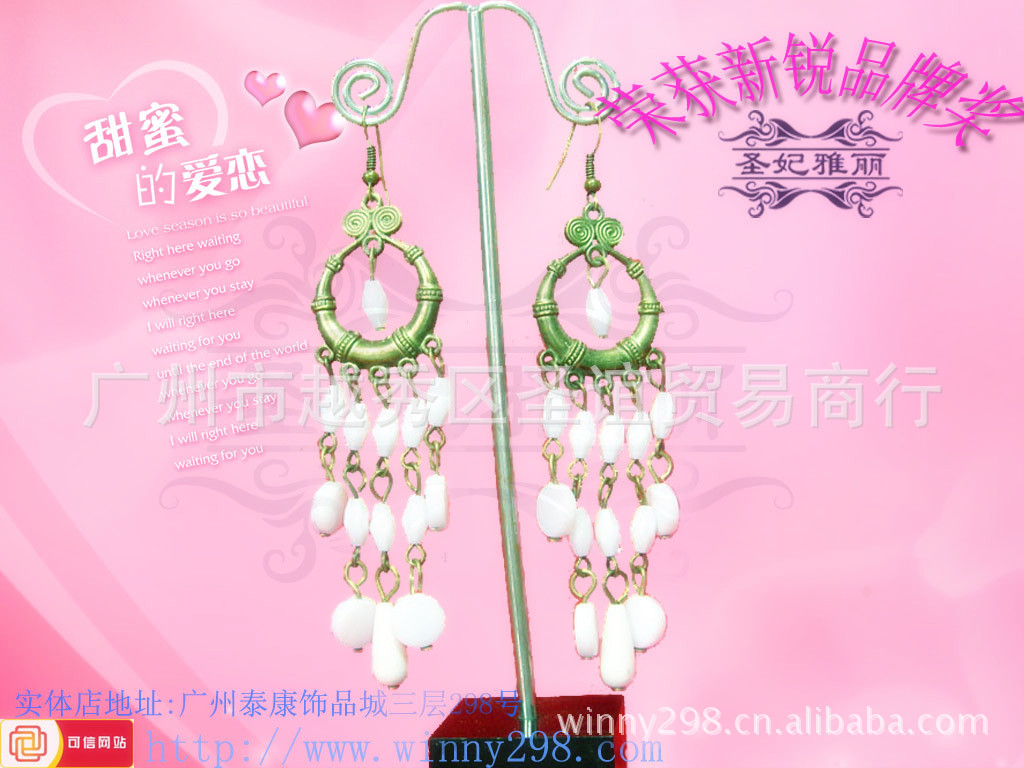 《圣妃雅丽》---随着“中国风”在国际时尚界盛行,圣谊贸易商行推出了以“古典和时尚”合并元素的古典耳环品牌《圣妃雅丽》,传递着它来自古时的讯息,续写着古为今用的古典首饰。纯手工制作,原创设计,集民族、传统特色;异域、潮流时尚风格的《圣妃雅丽》耳环,让每位女性爱不释手,更具女人味 。