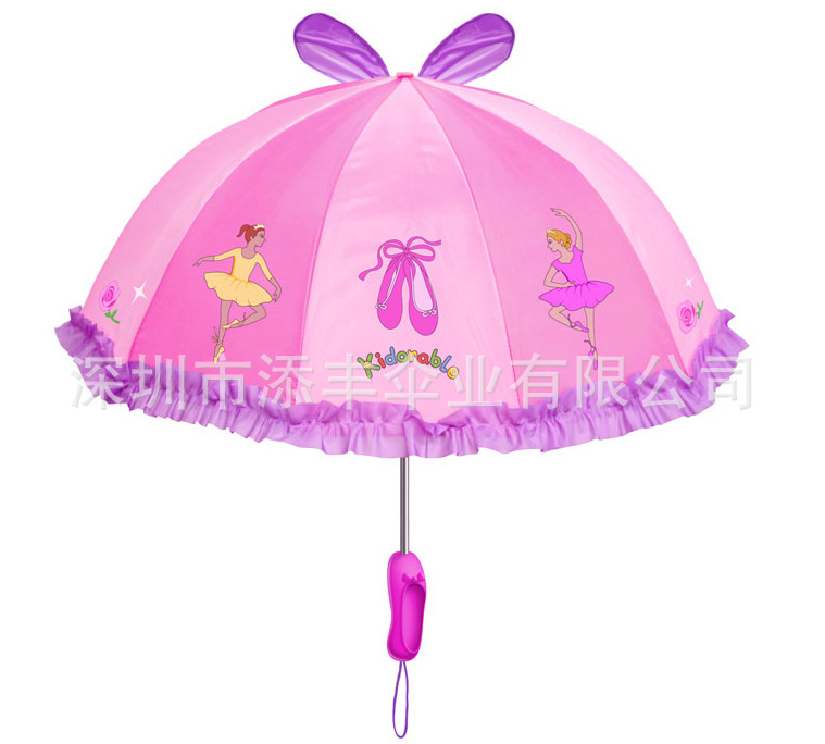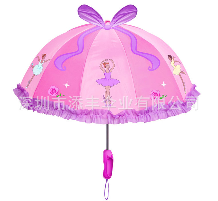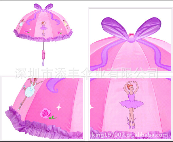 漂亮公主小雨伞,新颖可爱,尽显童真趣味,童年时的伙伴,特别是芭蕾款的伞顶蝴蝶结装饰和伞柄末端的芭蕾鞋造型,设计新颖特别,让人爱不释手,小宝宝见了,一定会爱上它的哦!