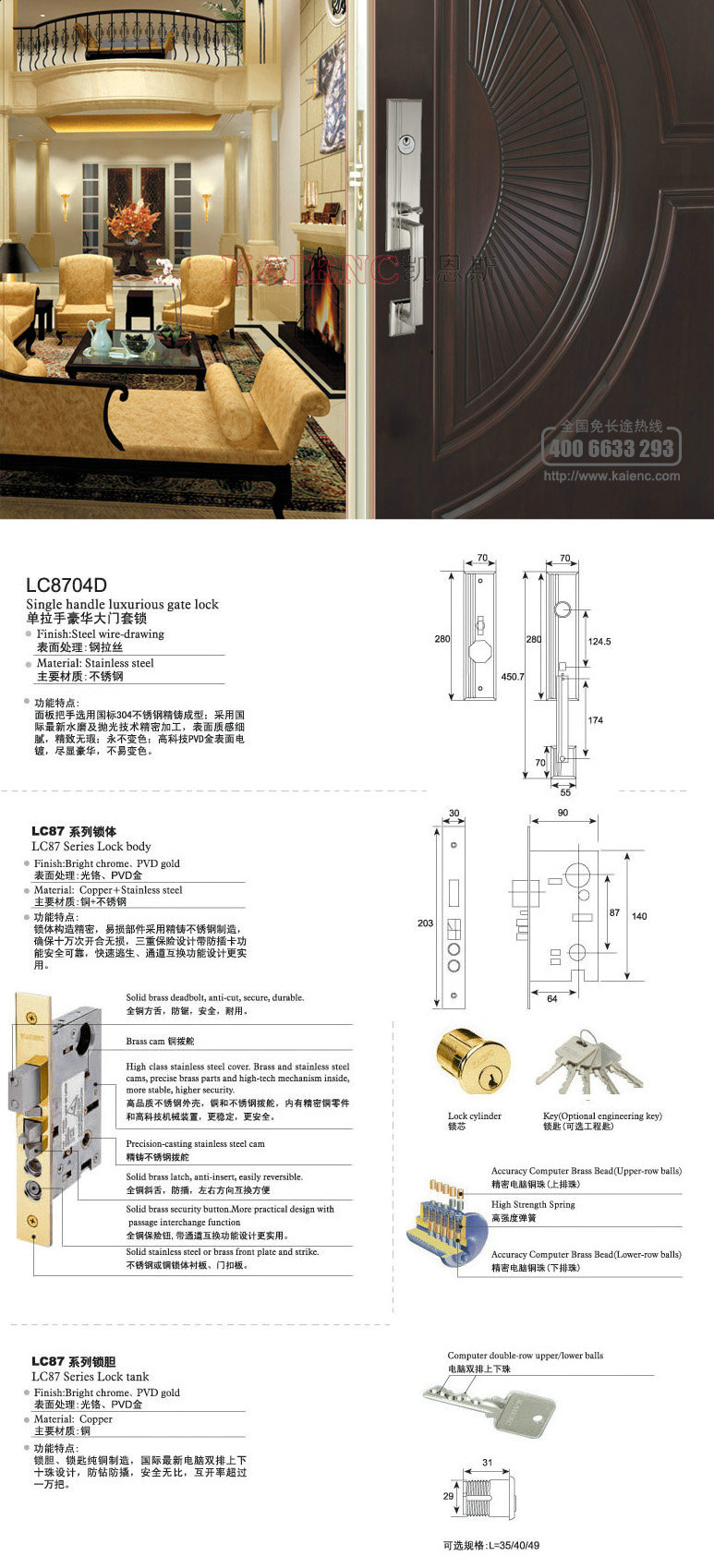 面板把手选用优质304不锈钢精铸成型,采用国际最新水磨及抛光技术精密加工,表面质感细腻,精致无暇,永不变色。锁芯锁匙纯铜制造,国际最新电脑双排上下十珠设计,防钻防撬,安全无比,互开率超过一万把。锁体构造精密,易损部件采用精铸不锈钢制造,确保十万次开合无损,并带闭锁功能令你安枕无忧。最适合高端装修的用户使用。
