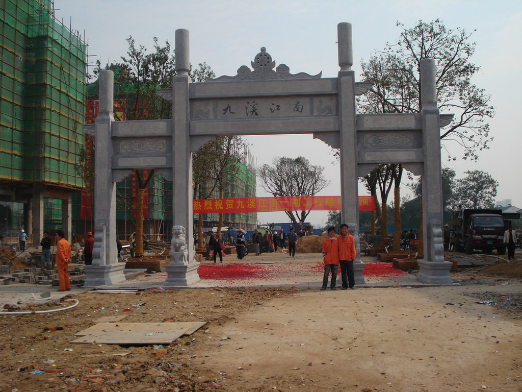 开荒,就是在石料上凿去多余部分。首先是“开大荒”,石牌坊、石雕牌坊雕刻出大体轮廓,进一步打出基本形状的过程叫做“开中荒”,一般加工到离石膏模型形体约1厘米左右叫“开小荒”。三个过程有时交替进行,所使用的工具为大、中、小錾子和锤子。第二个步骤为“打细”,就是将“开小荒”余下的多余部分凿掉,重点是刻画形象和找准形体的起伏结构等微妙变化,是对石雕像进行艺术处理的重要阶段,使用的工具为齿凿、平凿、石锉等。这个阶段需要耐心的精雕细刻。第三步骤为“打磨”,就是在打细石雕的基础上,用研磨材料进行打磨、抛光。打磨的工具和材料有抛光机、砂轮、纱布、纱纸等。此道工序是根据石牌坊、石雕牌坊艺术效果而进行的,有的是全部通体打磨,有的是局部打磨。传统的寺院石牌坊、石雕牌坊制作,不论在开荒、打细还是打磨阶段,基本上都是石匠使用大小不同的錾子和锤子一点一点地砸出来的。没有抛光机的时候,石匠先用花锤和剁斧在石雕表面砸一遍进行整平,然后使用磨石或砂轮进行石牌坊、石雕牌坊最后处理,使之产生较为平滑的效果。采用现代化的雕刻工具后,工匠们有时用花锤或剁斧砸一遍留下均匀麻点或细直线条的效果,是为了对石牌坊、石雕牌坊作品的表面进行装饰,是一种仿古的装饰手法,也是寺院石牌坊、石雕牌坊制作的最后一道工序。