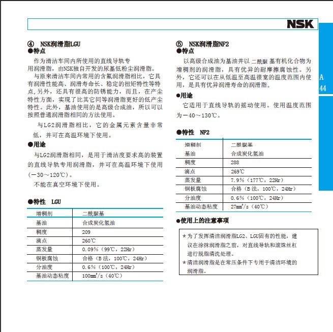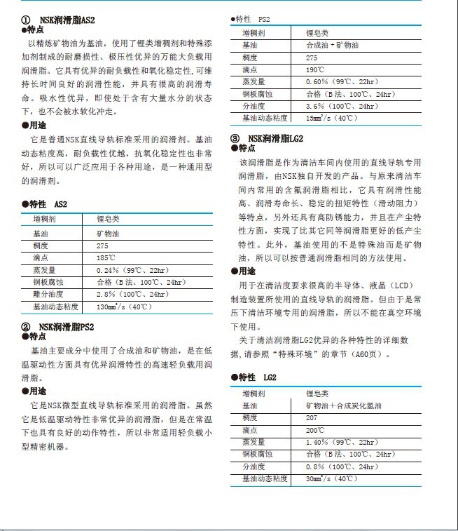 特点作为清洁车间内使用的直线导轨和滚珠丝杠等专用润滑剂,由NSK独自开发的有机低粉尘润滑剂。与原来清洁车间内常用的含氟润滑剂相比,它具有润滑性能高、润滑寿命长、稳定的扭矩特性等特点,另外,还具有很高的防锈能力,而且,在粉尘特性方面,实现了比其它同等润滑剂更好的低生尘特性。此外,基油使用的是高级合成油,所以可以按照普通润滑剂相同的方法使用。与LG2润滑剂相比,它的金属参数含量非常低,并可在高温环境下使用。