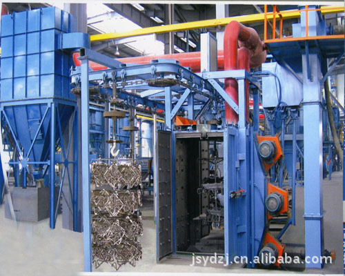 Q483双行程吊链式抛丸机具有工件静态装卸、自动快速输送与定位,工件旋转抛丸清理。整机采用常规电器控制,工件的输送轨道无级变速。适合于大批量、铸钢、铸铁、及焊接件的全方位抛丸清理,用于各种形式的可吊挂式工件。通过抛丸清理,不但可以去除工件表面的锈蚀,清理掉结构件上的焊渣,还可以消除工件的焊接应力,提高工件的抗疲劳强度,增加工件喷漆时的漆膜附着力,并最终达到提高整个工件表面及内在质量的目的。广泛用于冶金、石油、化工、机械等行业。