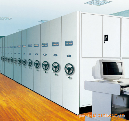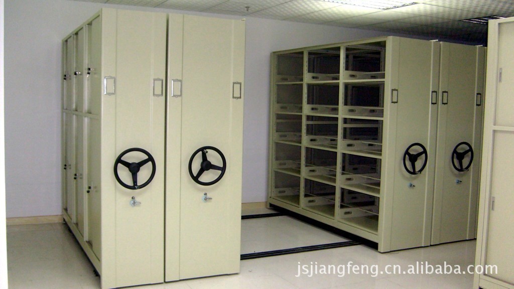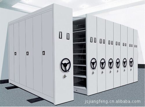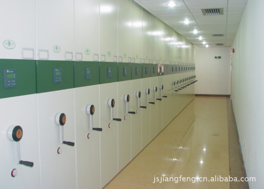 顺时针或逆时针摇动手柄,活动架将在轨道上行走,当相邻二架体间距离移开到一定值,顺时针转动两列架体的自锁柄至OFF位置,此时再摇动手柄,二架体不能再移动,然后可进入架体间存放文档。