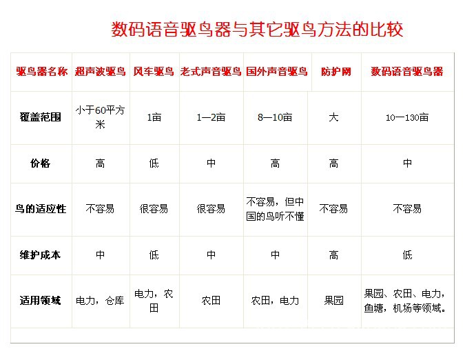 目前传统驱鸟方法主要有化学气味驱鸟,声音驱鸟,视觉驱鸟和物理工具等几种方法,而声音驱鸟目前大多采用专人看守吆喝、敲锣、放炮等,这些方法不是很费力就是使鸟适应而效果不佳,从而失去作用。杨凌嘉丰农业科技有限公司联合国家有关单位和西北农林科技大学鸟类学和声音学专家,通过多年对我国不同地区,不同季节和不同领域的鸟害情况调研,深入研究了鸟类生活习性,鸟害事故起因,同时吸取国外的先进驱鸟经验,在以前第三代智能语音驱鸟器推广使用的基础上,大量回访使用户的建议和意见,对以前第三代智能语音驱鸟器进行全面技术升级换代,推出了功率更加强大,驱鸟效果更佳的第五代数码语音驱鸟器,从而在声音驱鸟领域做到了国内一流水平。
