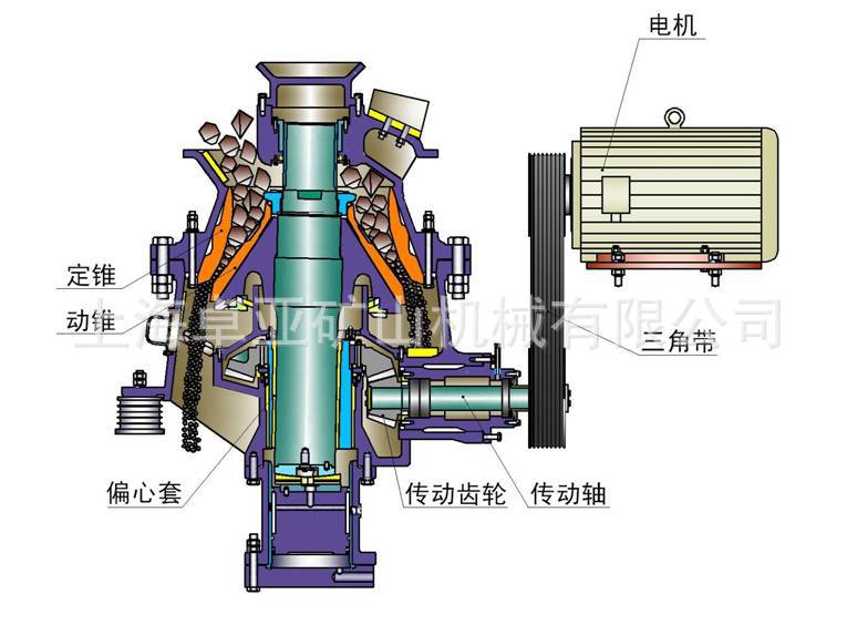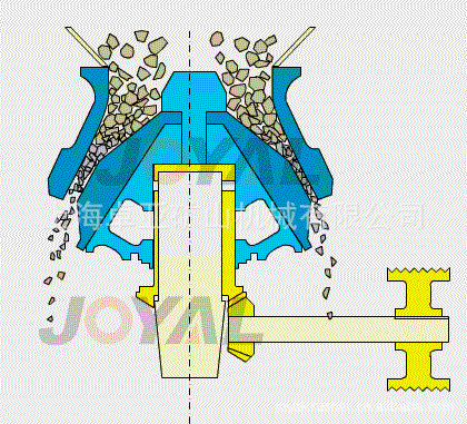 圆锥破碎机工作时,电动机通过弹性联轴器、传动轴和一对锥齿轮带动偏心轴套转动,破碎圆锥轴心线在偏心轴套的迫动下做旋摆运动,使破碎壁和轧臼壁时而靠近,时而远离,矿石在破碎腔内不断地受到挤压、撞击和弯曲而被破碎。