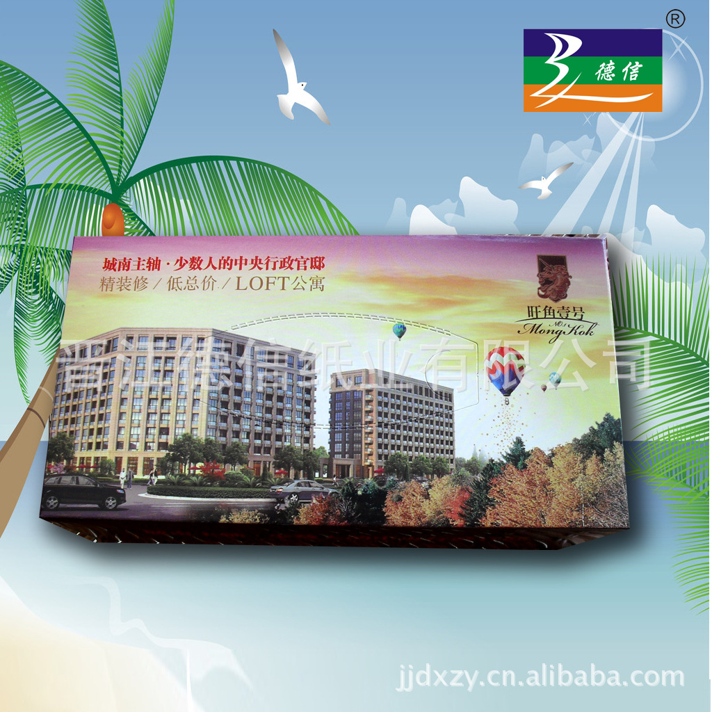 盒装纸巾外包装为350克白板纸,可四色印刷,内装抽纸为高级原生木浆纸,产品柔软细腻,吸水性好。