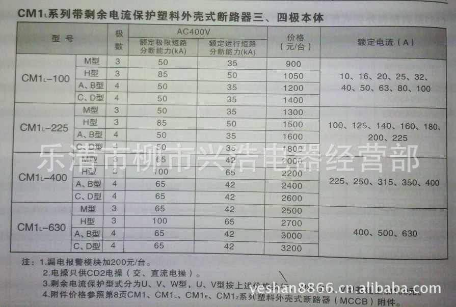 注:常熟开关CM1L系列带剩余电流保护塑料外壳式断路器三、四极本体具体价格,请用旺旺或者电话 13989767759叶小姐咨询!