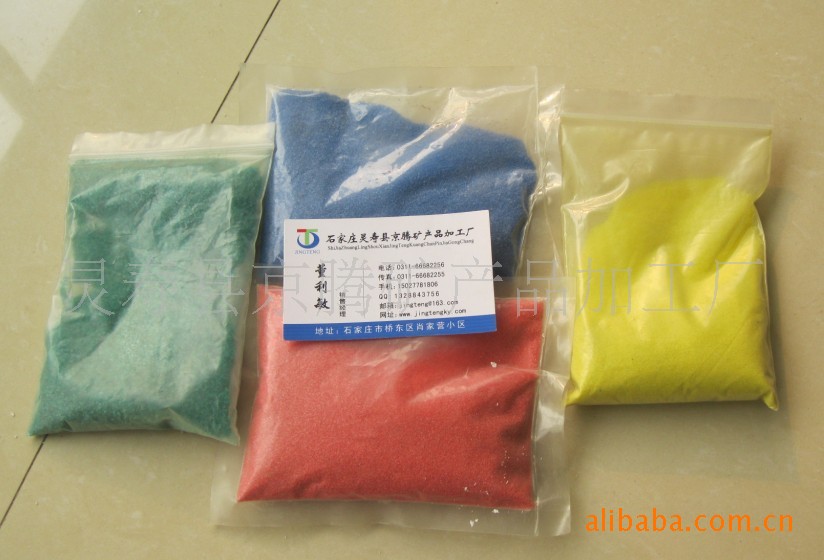 彩砂现分为天然彩砂、临时染色彩砂、烧结彩砂、永久染色彩砂、染色石英砂、圆粒彩砂。
