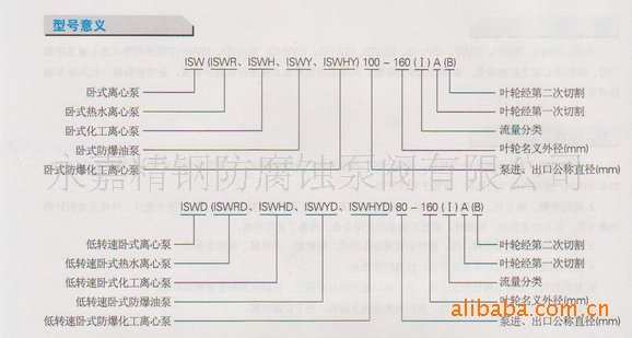 工作条件 1、吸入压力≤1.0Mpa,或泵系统最高工作压力≤1.6Mpa,即泵吸入口压力+泵扬程≤ 1.6Mpa、泵静压试验压力为2.5Mpa,订货时请注明系统工作压力。泵系统工作压力大于 1.6Mpa时应在订货时另行提出。以便在制造时泵的过流部件和联接部分采用铸钢材料。 型号说明 |