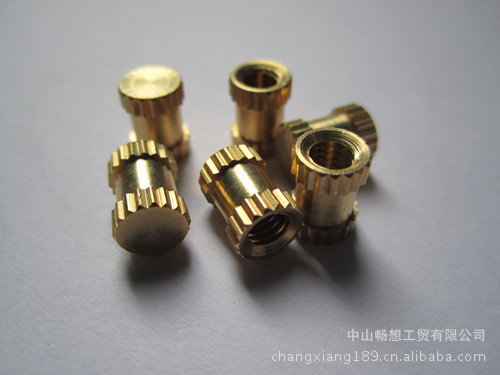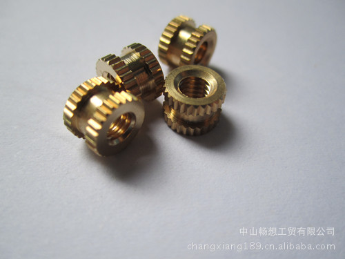 直纹花/斜纹花/八字人字纹压花及其它各种防滑型花纹铜螺母自动车床一次性完成,较复杂的铜螺母则加上成型刀加工及桌上车/攻牙机等后加工很多产品是较为简单的网纹铜螺母和直纹铜螺母,材质为C3604易车削黄铜.表面花纹为原棒直接拉花,花纹饱满齿峰齿底清晰可见.注塑进塑料件后能承担更多大扭力.