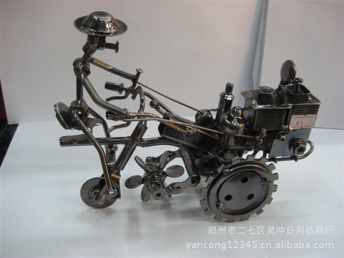 铁艺大号摩托车。手工制作。创意礼品。保质期20年 郑州市二七区灵冲日用商行前身是郑州市金鑫铁艺厂成立于九八年九月,是一家专业从事铁艺礼品设计、生产及销售的综合性私营独资企业。公司从创立到现在因其厂家直销价格低的优势、贴心的服务以及过硬的质量一直受到广大批发商、零售商、淘宝网、拍拍网代理商等的大力支持与信赖。公司拥有完整、科学的质量管理体系.凭诚信、实力和产品质量获得业界的认可。 我们公司生产的老爷车系列产品(包括汽车,火车,消防车、吉普车、摩托车、飞机,加油器等),全部工艺均用铁皮为材料仿真制作,从零件加工到组装、上色,全部由手工完成,细节丰富,配合仿古的喷绘效果,有很高的观赏和收藏价值,适合家居装饰、业余收藏和礼品赠送。目前已经推出的款式已经达到近千种,仍不断开发新的产品,也可根据用户的要求进行个性定制。 经过多年的发展,凭着良好的信用、优良的服务与众多厂家建立了长期的合作关系。热诚欢迎各界朋友前来参观、考察、洽谈业务。. 骑士马。16号