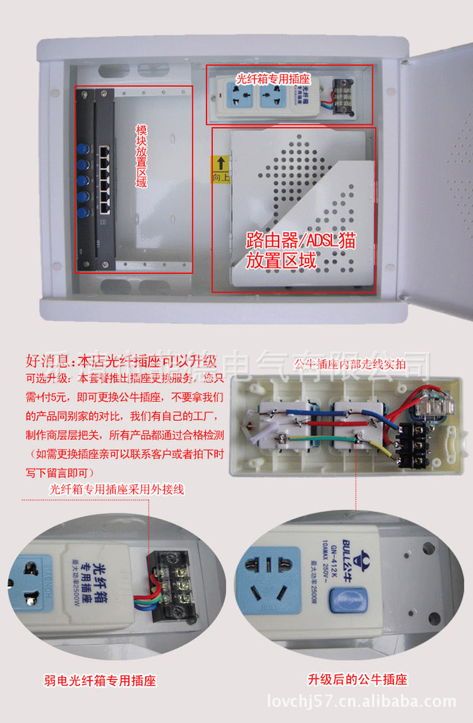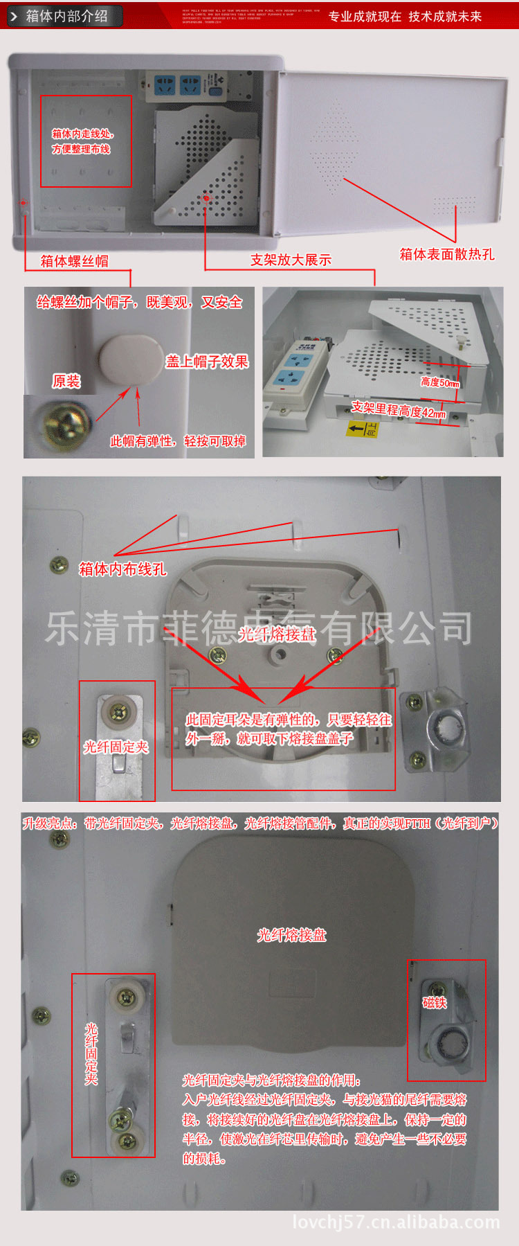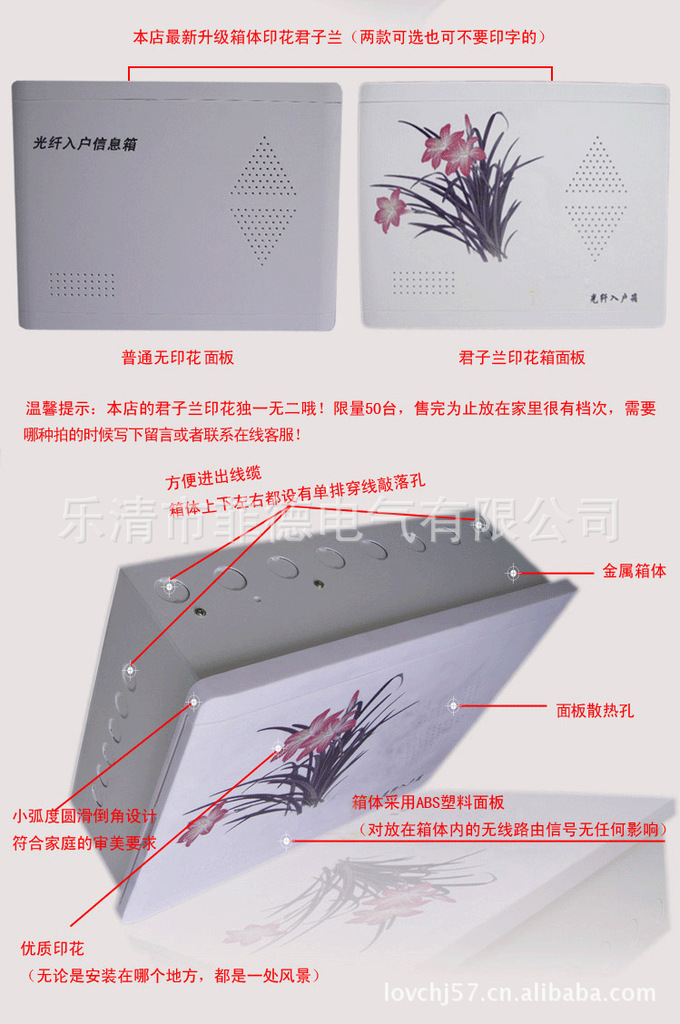 注:面板可选用冷轧钢板。型号为:FTTH 光纤入户信息接入箱。 名称: 光纤入户信息箱 入墙尺寸: 250mm X 300mm X 120mm 350mm X 300mm X 120mm 400mm X 300mm X 120mm 450mm X 300mm X 120mm 500mm X 300mm X 120mm 等等多种尺寸 , 标准配置:光纤固定夹,光纤熔接盘,2位多功能插排,ONU安装支架,真正实现FTTH(光纤到户)。 箱体说明: 全金属箱体,支架螺丝孔距21.5cm,可选用所有GB全系列模块。 面板材质: 1mm优质冷轧钢板,表面灰色细纹静电喷涂,抗划伤,(或者乳白色搭配装修后白色的墙面,效果很好)。 箱体材质: 1mm优质冷轧钢板,表面灰色细纹静电喷涂,抗划伤,(或者乳白色搭配装修后白色的墙面,效果很好)。 另有铁底塑面的,以下入墙尺寸! 250mm X 300mm X 120mm 350mm X 300mm X 120mm 400mm X 300mm X 120mm 光纤入户装修首选: 1.光纤套装满足家庭全部电视电话网络配置 2.即使你现在是宽带用户也可选择光纤弱电箱系列,为以后的光纤升级做准备。 3.金属面板不必担心模块的散热问题,免去了塑料面板散热的危险性,运输安装也不易损坏;而采用高档豪华ABS朔料面板,有较解决箱内无线路由器信号不被屏蔽,信号更稳定。这也是一个优点。 4.标准模块,不必担心以后模块损坏而买不到相应产品的匹配 5.产品自购买日起质保一年。